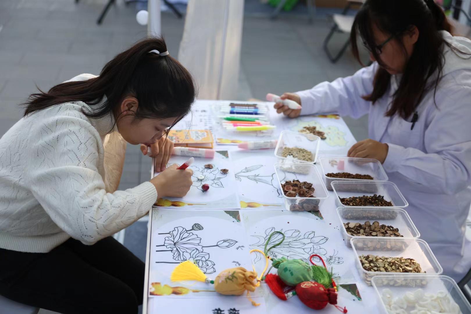 趣味针灸、药材识别、香囊制作……现场共分四大区域,在“福来”区域,市民们沉浸在浓郁的本草知识氛围中,通过亲手制作香囊和参与“以花入谜庆重阳”的互动游戏,不仅增长了药材知识,还体验到了中医药文化的乐趣。