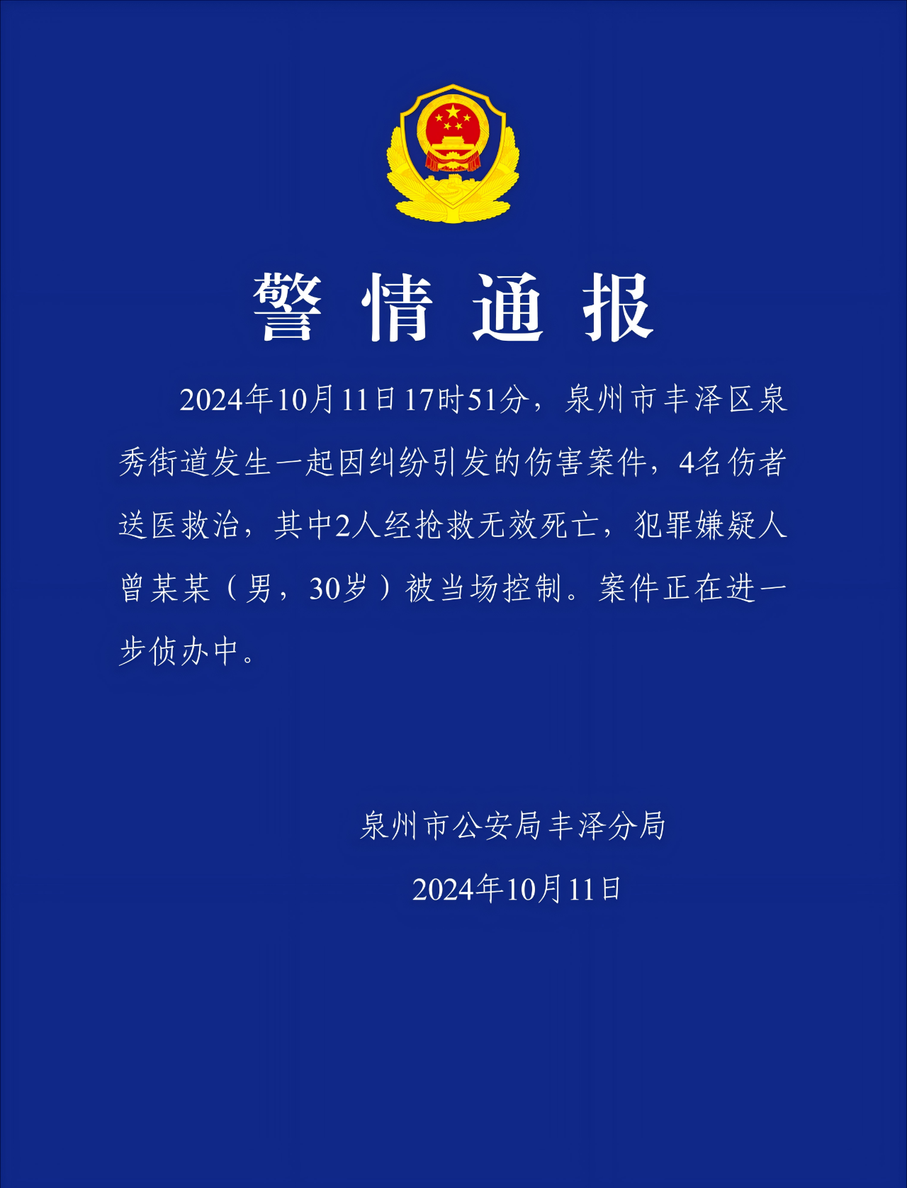 泉州警方通报一起伤害案:4人送医,其中2人死亡,嫌疑人被当场控制