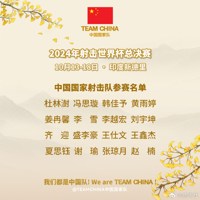 据新华社消息,2024年射击世界杯总决赛将于10月13-18日在印度新德里举行。黄雨婷、盛李豪、李越宏、谢瑜、刘宇坤等选手将参加。中国队参赛名单如下↓↓