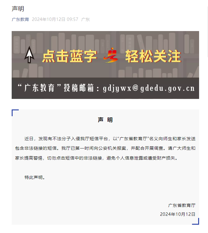 新京报讯 广东省教育厅10月12日发布声明称,近日,发现有不法分子入侵广东省教育厅短信平台,以“广东省教育厅”名义向师生和家长发送包含非法链接的短信。广东省教育厅已第一时间向公安机关报案,并配合开展调查。请广大师生和家长提高警惕,切勿点击短信中的非法链接,避免个人信息泄露或遭受财产损失。