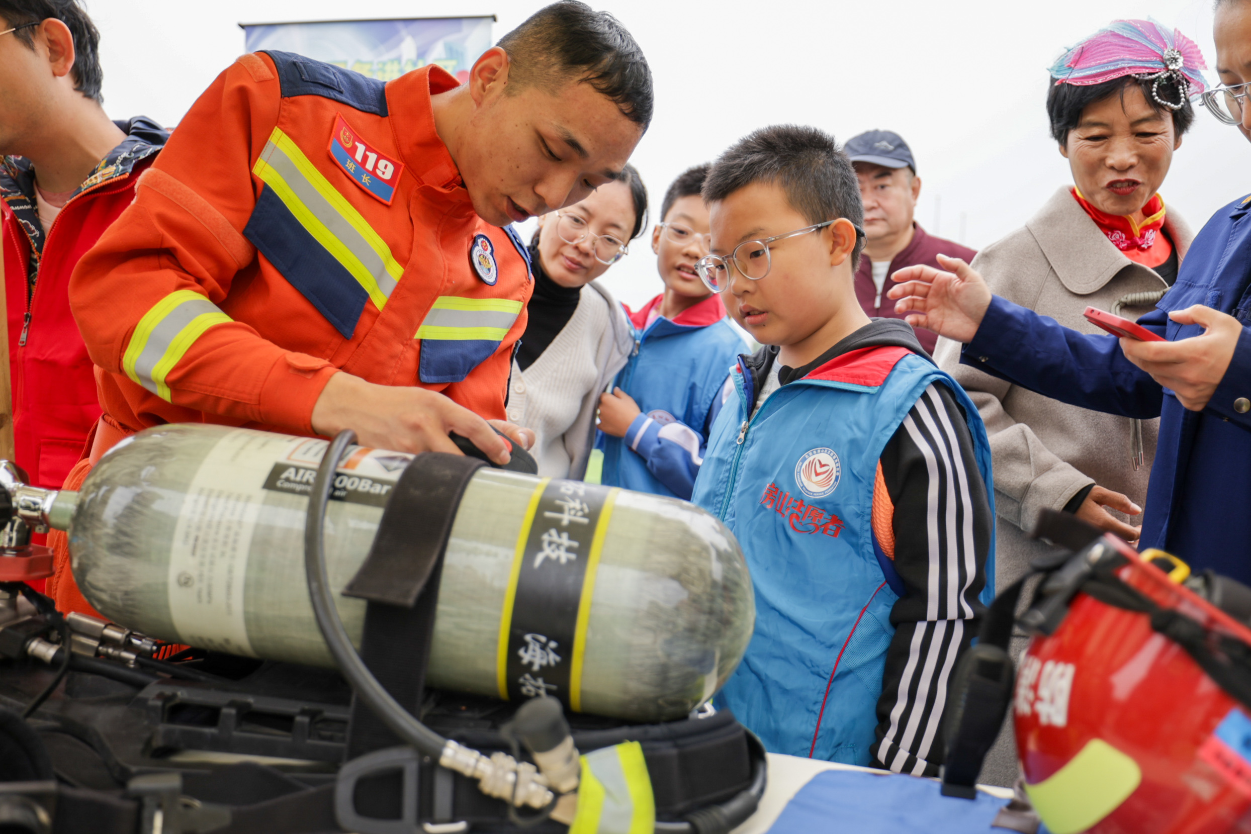 房山消防现场讲解正压式空气呼吸器。新京报记者 王子诚 摄