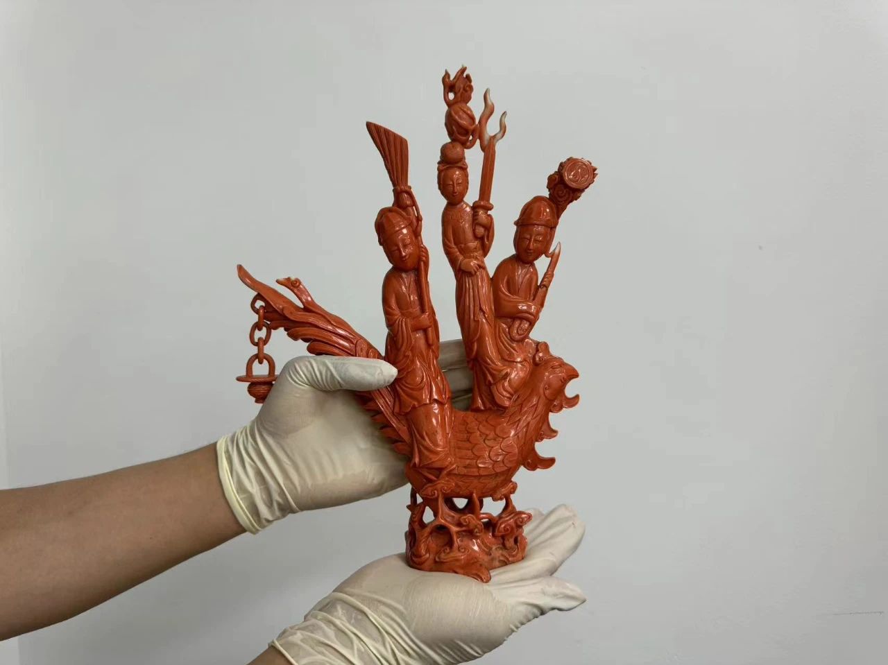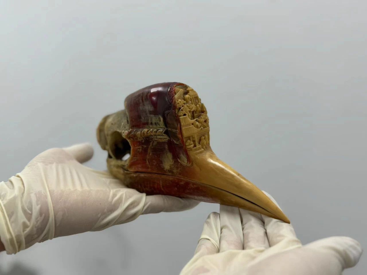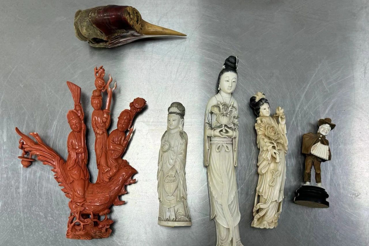 经鉴定,该批工艺品的材质包括盔犀鸟头骨、红珊瑚、象牙。其中盔犀鸟、现生象均为《濒危野生动植物种国际贸易公约》(CITES)附录Ⅰ列明保护物种,红珊瑚属于国家一级重点保护水生野生动物。目前,该案已移交缉私部门处理。