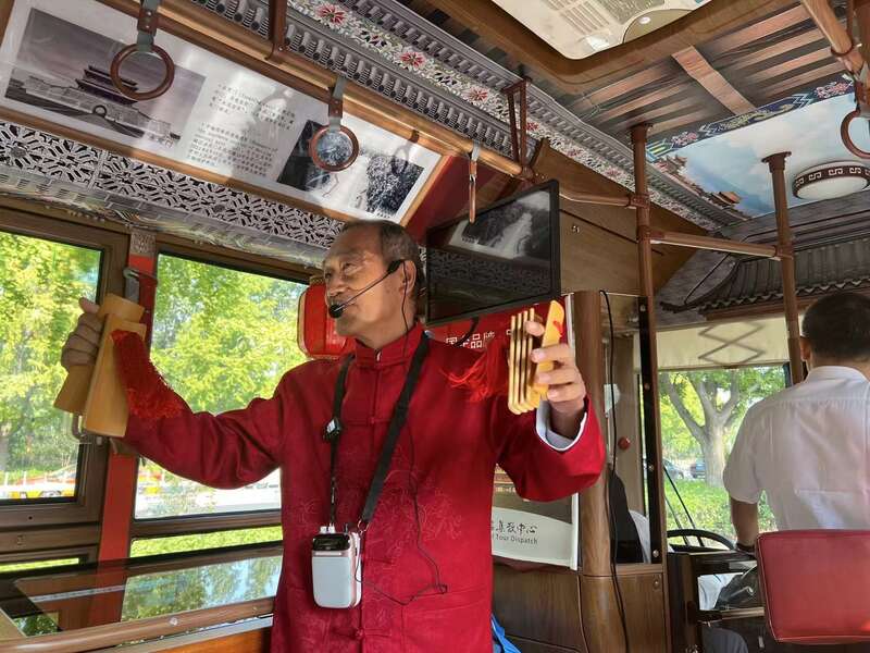 “大美中轴线”观光巴士的一些讲解员还有“绝活”,来一段传统曲艺节目不在话下。张旭涛就是这么一位老北京,骨子里透着北京人的热情,有一肚子关于北京中轴线的故事,时不时插入一段小节目。