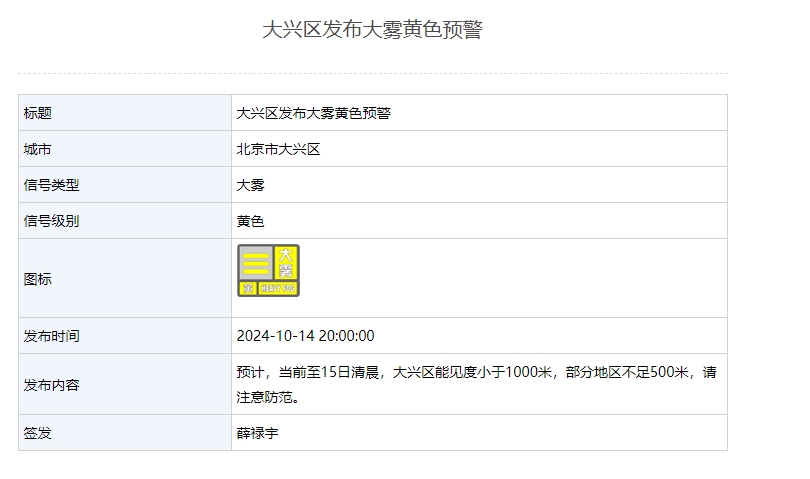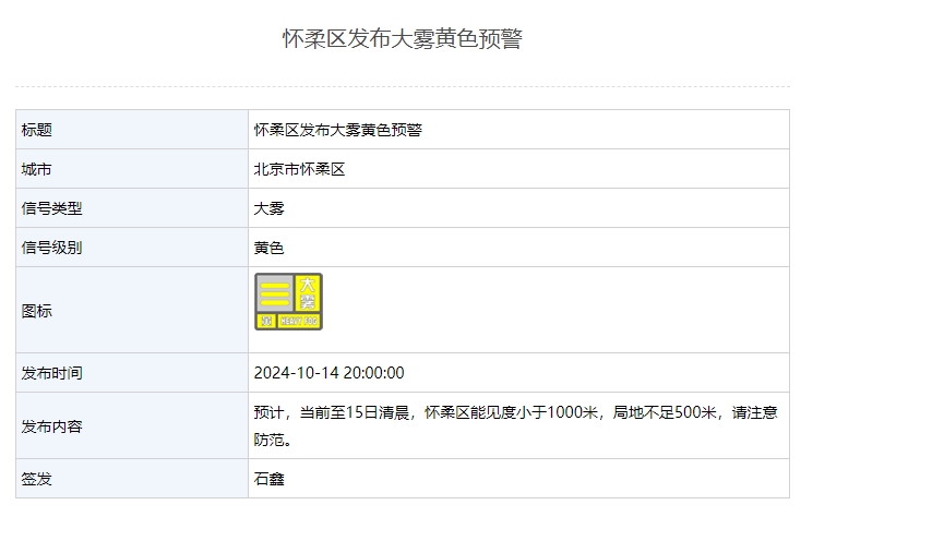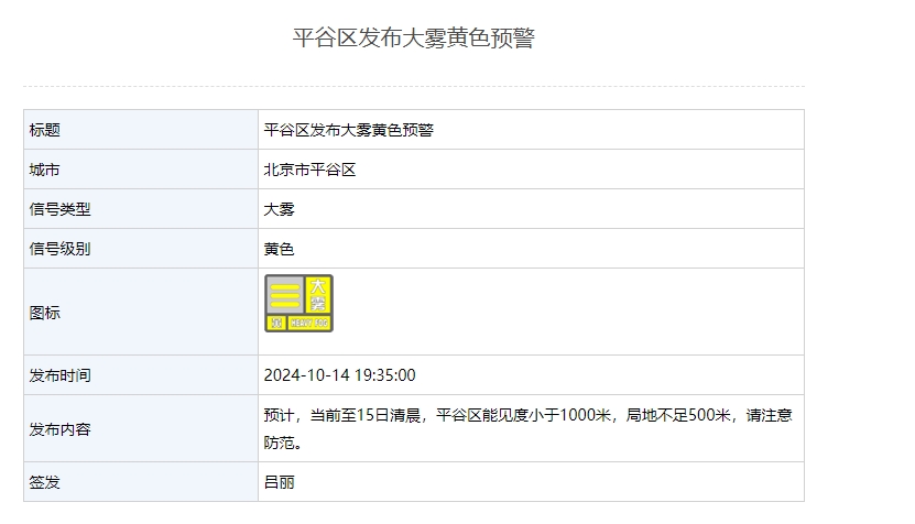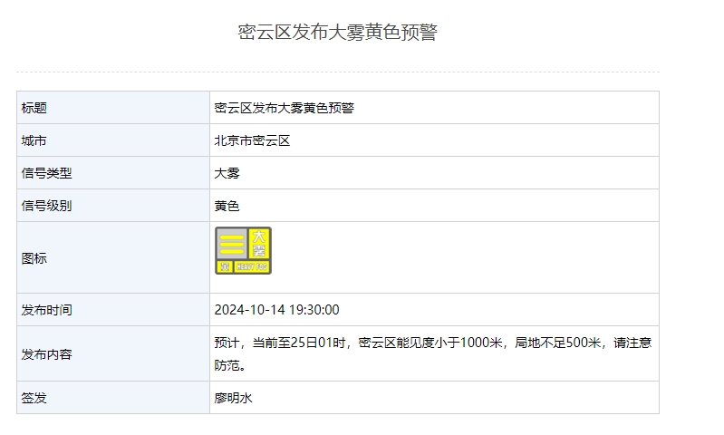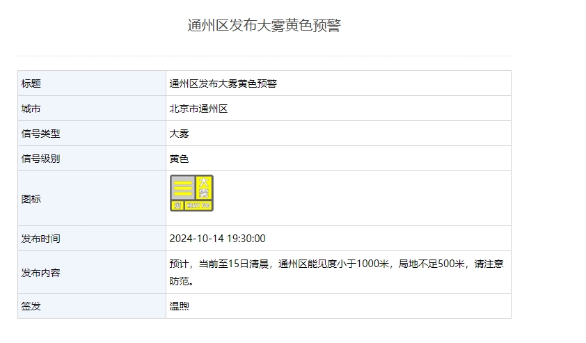 新京报讯 据北京市气象局网站消息,怀柔、密云、平谷、通州、大兴区发布大雾黄色预警,能见度小于1000米,部分地区不足500米,请注意防范。