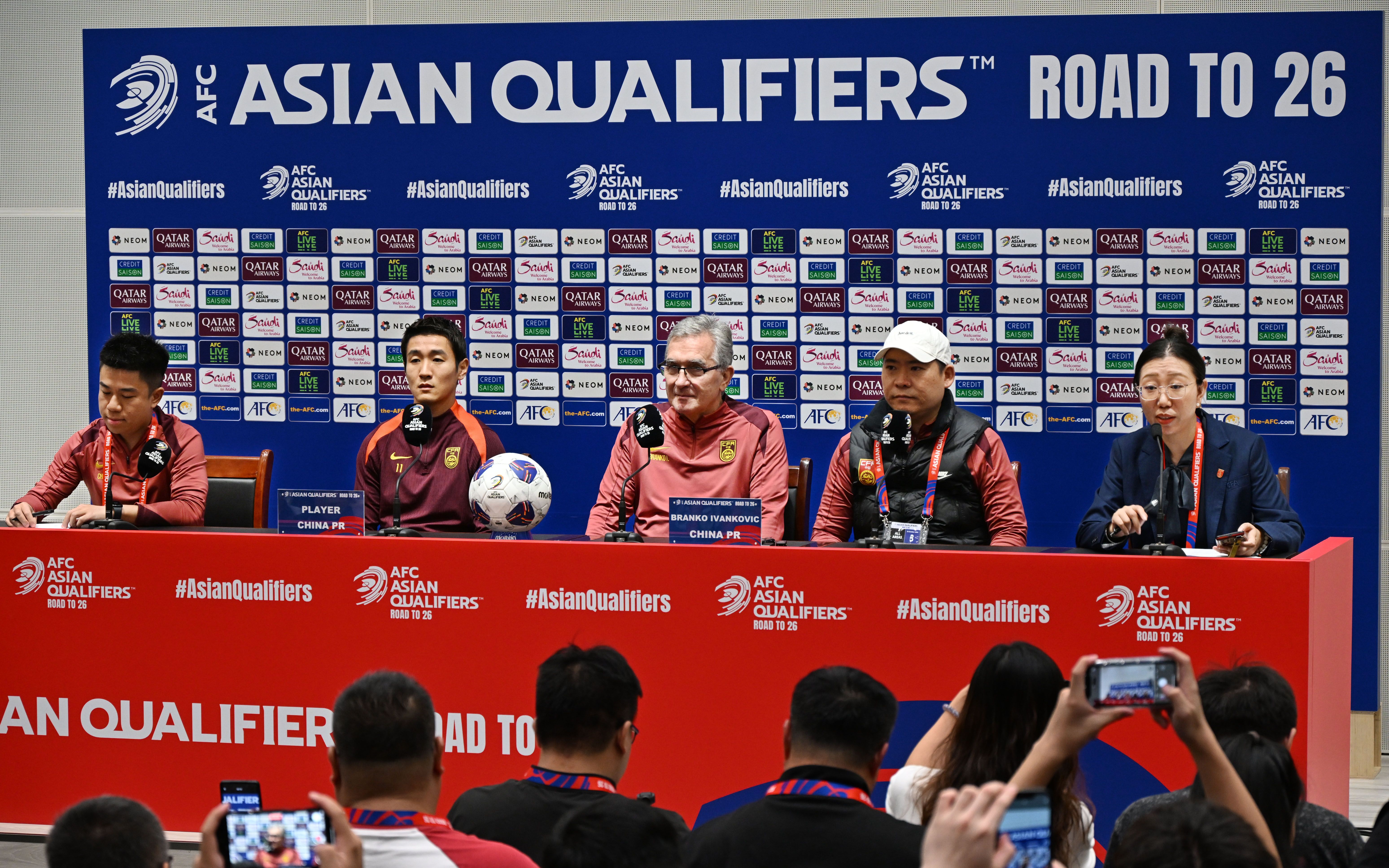 10月14日,中国国家男子足球队在山东青岛举行赛前新闻发布会。图/新华社