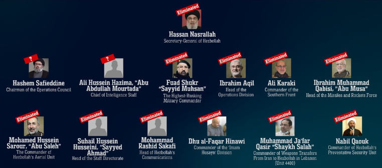 据央视新闻消息,当地时间15日,以色列国防军公布一张图片,显示真主党高级军事领导层除两名成员外都已经确认被打死。这两人是哈希姆·萨菲丁以及另一名黎真主党情报官员。