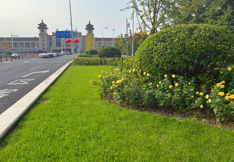 10月16日,北京站街两侧已铺上草坪种上月季花。2024年,北京市全面启动花园城市建设,东城区积极响应,通过分批分段开展城市路网绿化美化,建成了5条城市画廊、6条林荫路、11座绿色立交桥,实现了“繁花相伴,绿荫相随”的首都核心区出行体验。