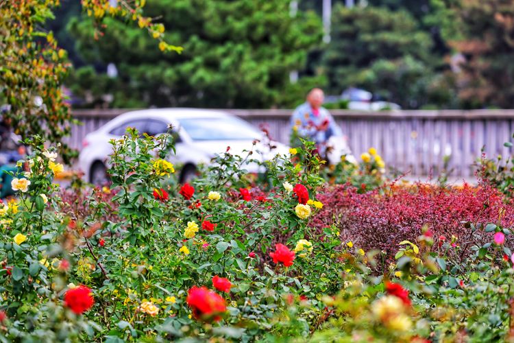 城市画廊建设统筹道路周边空间全要素,营造出色彩丰富、“一路繁花”的景观效果。西花市大街、南花市大街、北花市大街、前三门大街(东城段)及安定门东西大街组成的城市画廊全长4.96公里,总面积7750平方米。图为安定门外大街栽种的月季花。
