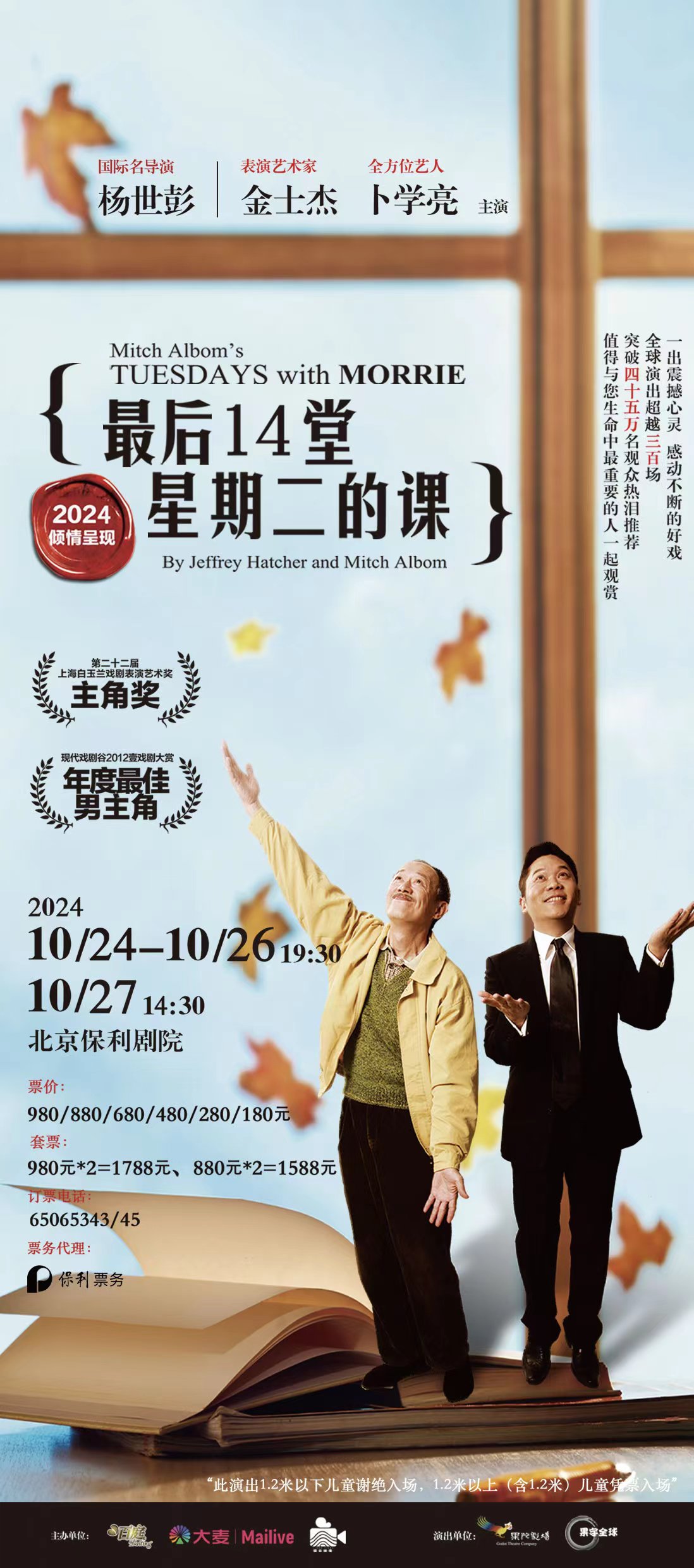 2013年,《最后14堂星期二的课》在北京海淀剧院两次成功上演,同时也在北京大学百年讲堂进行了演出。这部剧以其深刻的主题和精湛的表演,受到了北京观众的热烈欢迎和高度评价。而从2014年9月,《最后14堂星期二的课》初登北京保利剧院的舞台之后,十年间这部作品在北京保利剧院演出八轮之多,这样的演出频率和持续时间也充分体现了这部舞台剧在观众中的受欢迎程度和其在话剧市场的持久吸引力。