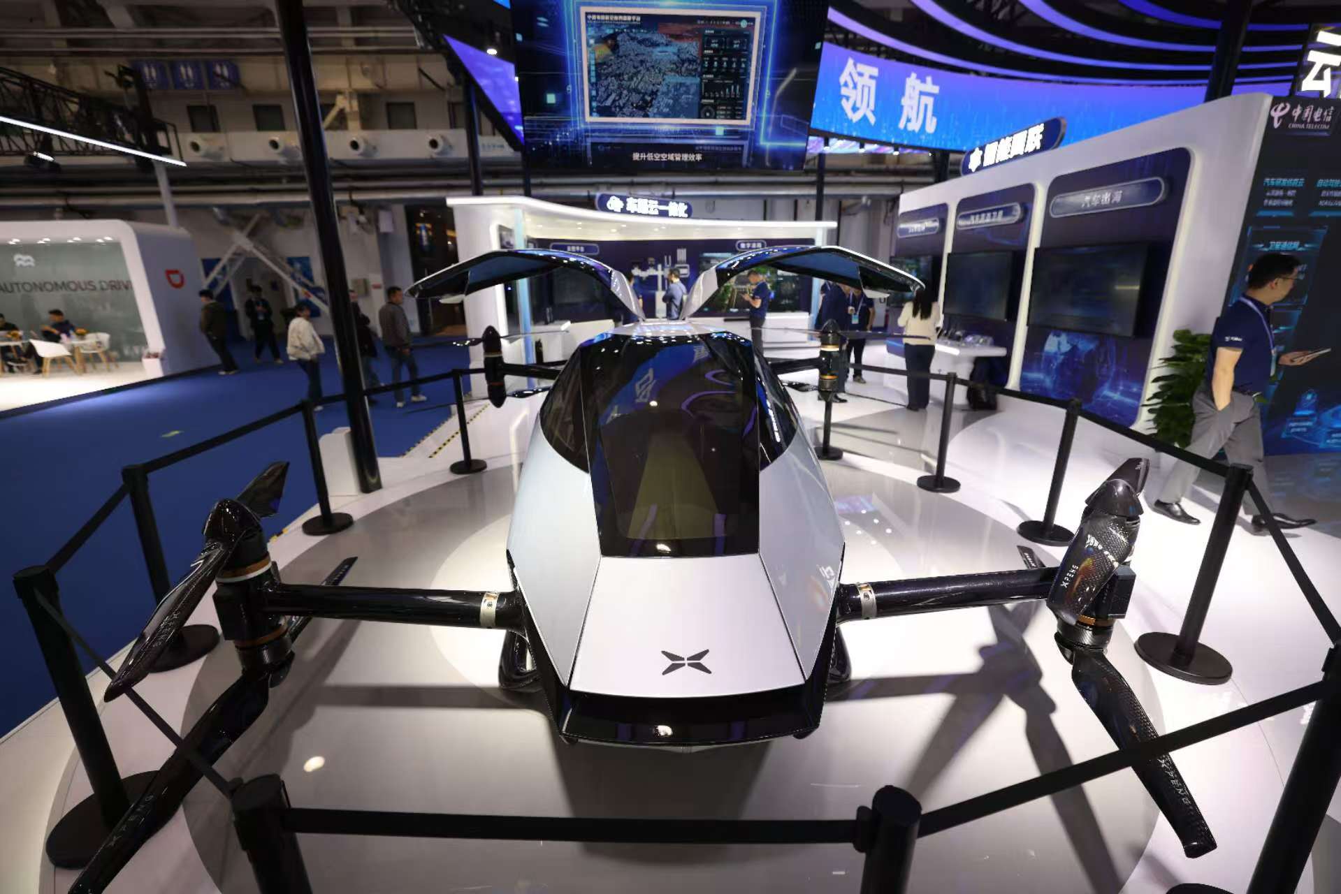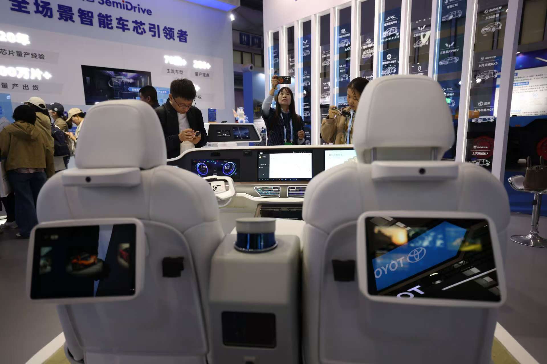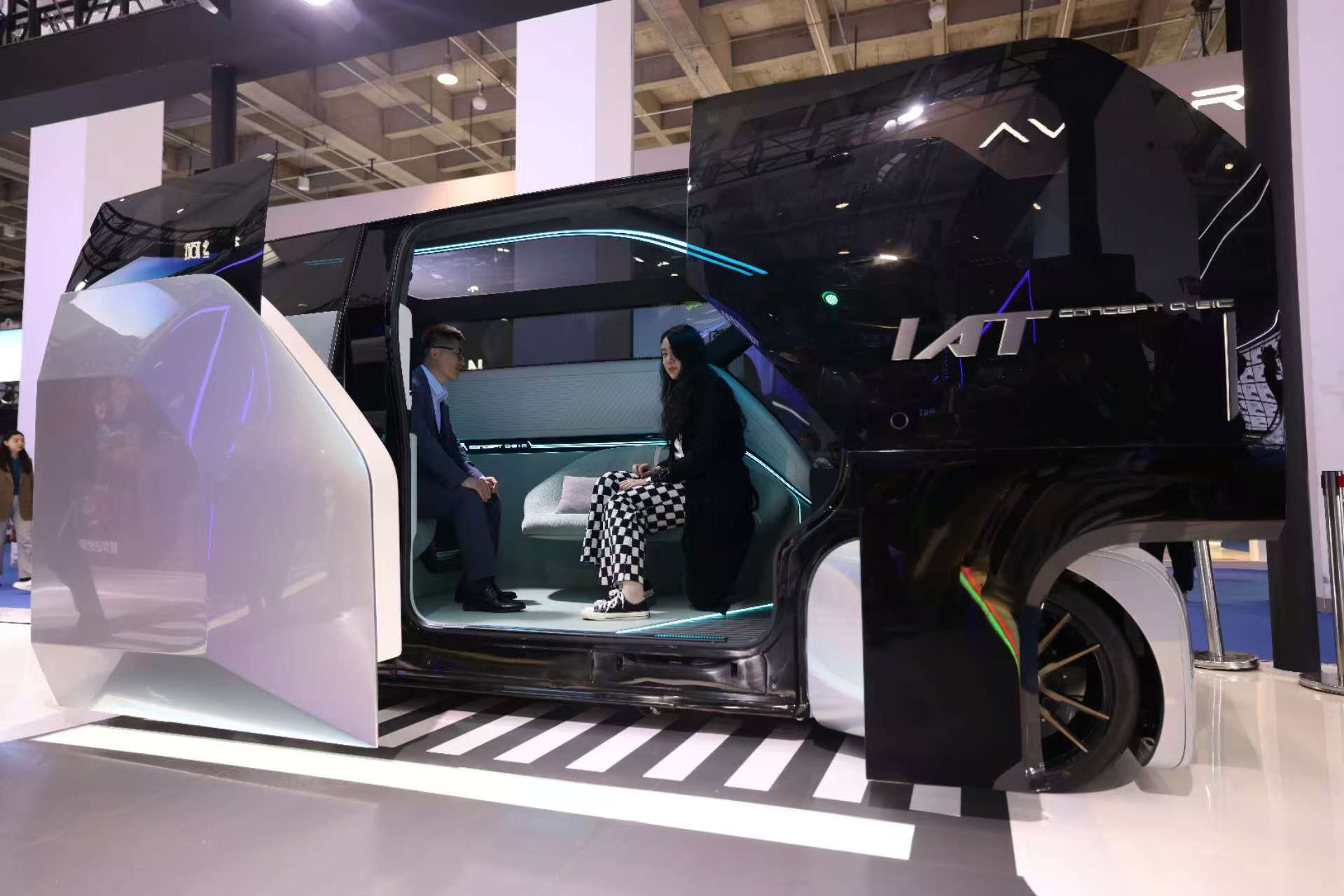 观众在参观一款没有仪表板、方向盘、制动踏板等设备,车身与轮胎融为一体的概念车。该车实现了L4级别自动驾驶,配备了智能化、人性化的智能网联系统,内饰环绕触控显示屏,配合语音控制系统、全息影像系统,为车内各个角落乘客提供便利的操作体验。
