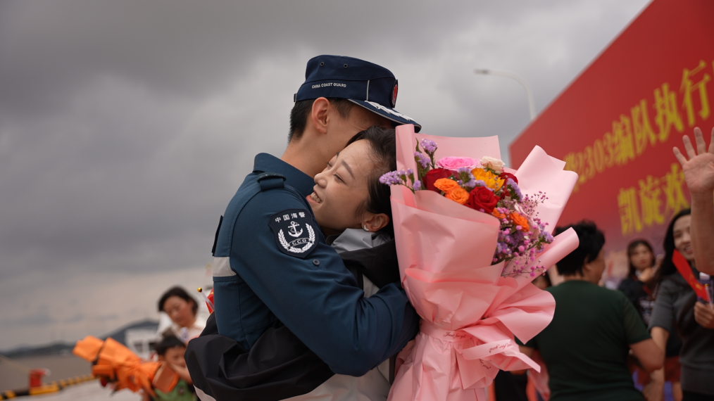 上午10时许,海警梅山舰、秀山舰依次停靠码头,中国海警局直属第二局在码头举行隆重的欢迎仪式,迎接编队凯旋。
