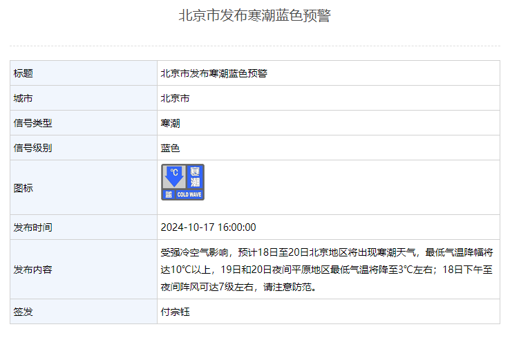 最低气温降幅将达10℃以上,北京市发布寒潮蓝色预警
