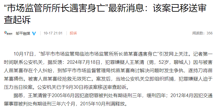 新京报讯 据邹平融媒官博消息,10月17日,“邹平市市场监管局临池市场监管所所长苗某喜遇害身亡”引发网上关注。记者第一时间联系公安机关,据反馈:2024年7月18日,犯罪嫌疑人王某清(男,52岁,聊城人)因与被害人苗某喜存在个人纠纷,到邹平市市场监督管理局找苗某喜商讨解决问题时发生争执,遂持刀将苗某喜捅伤。被害人苗某喜经抢救无效死亡。案发后,当地公安机关立即组织抓捕,犯罪嫌疑人迫于压力当日投案。公安机关已于9月30日将该案移送审查起诉。