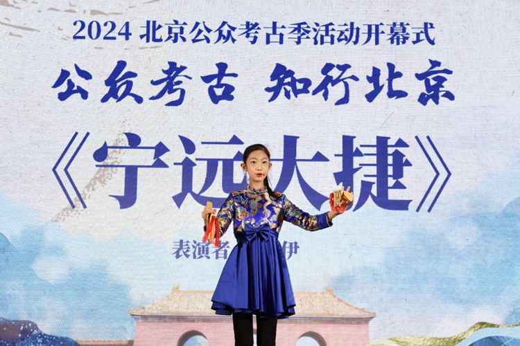本届公众考古季通过线上线下相结合的方式,分为体验考古、云端展示、考古讲座、考古进校园、绘本出版等5大板块、共计11项活动。图为小演员在开幕式上表演快板《宁远大捷》。