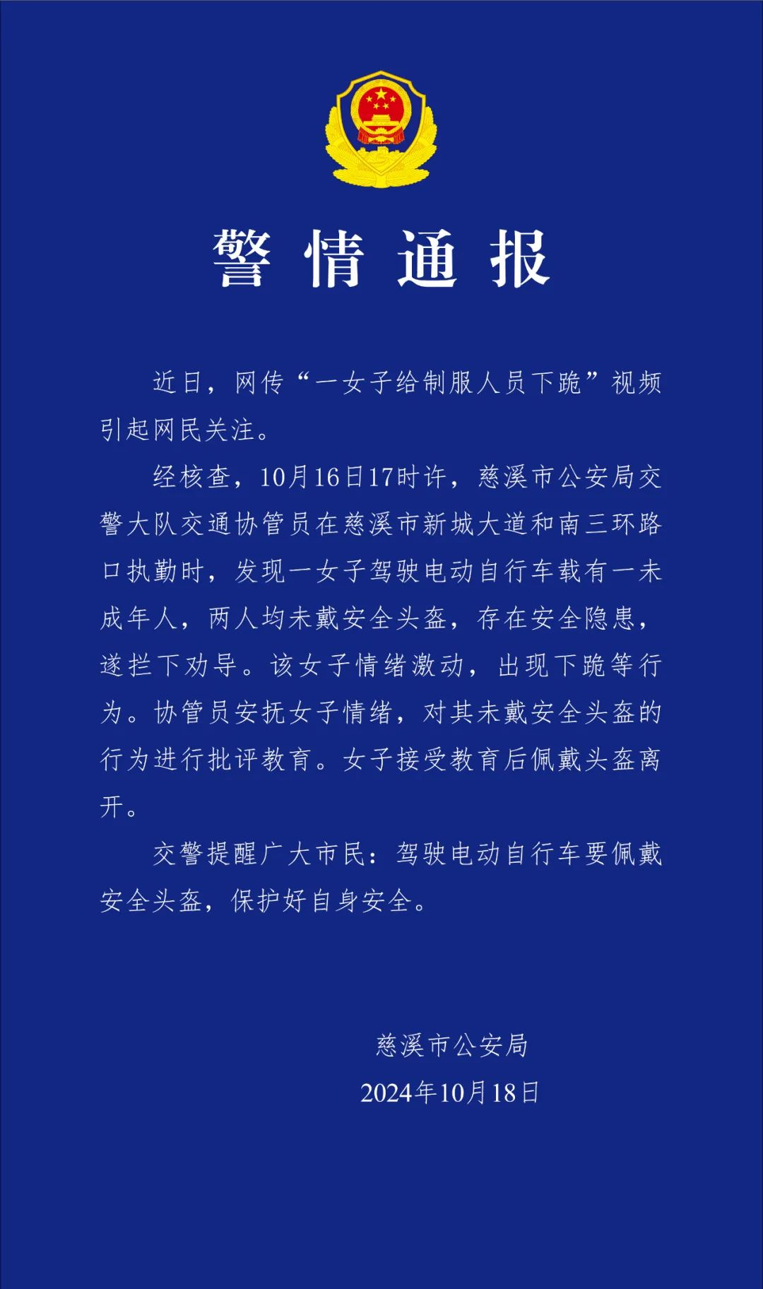 浙江慈溪警方通报“一女子给制服人员下跪”