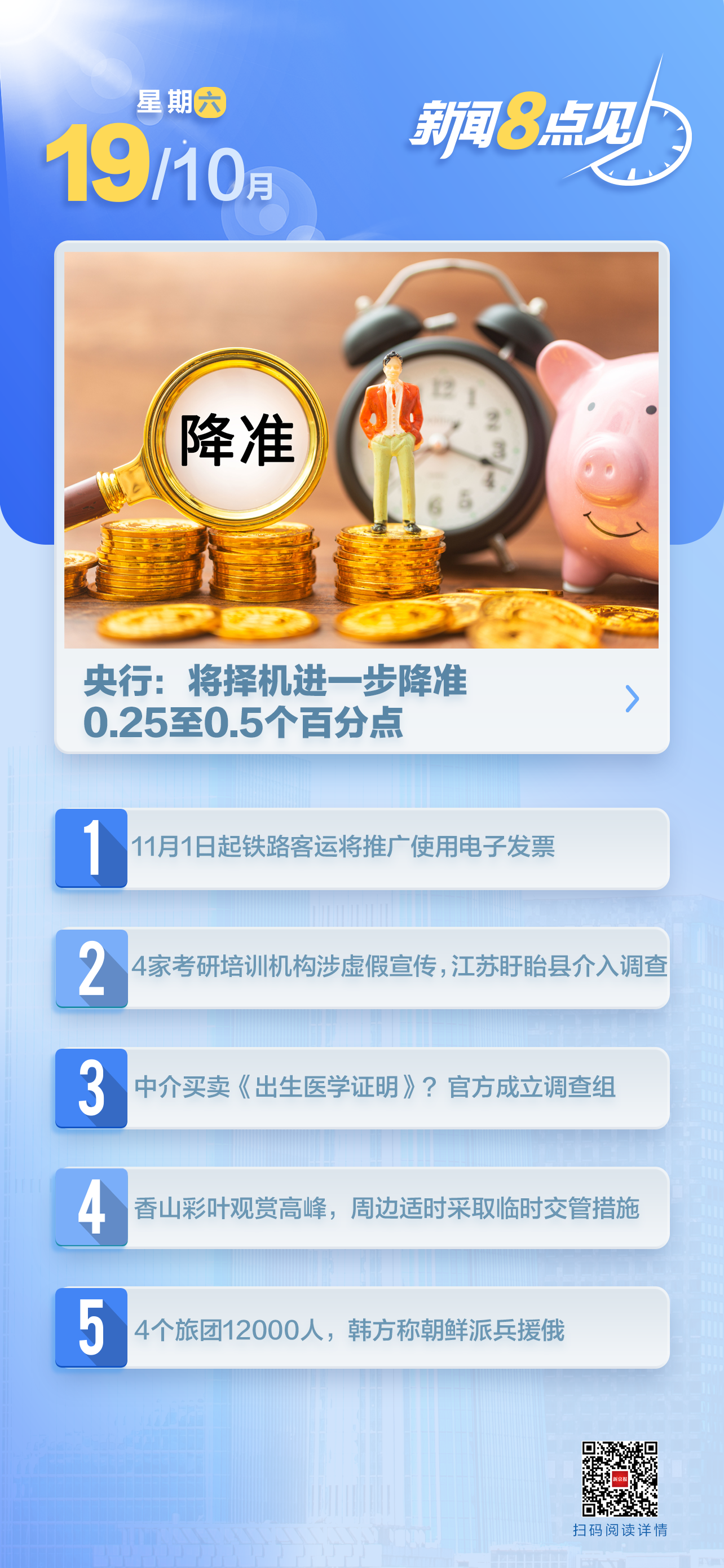 央行行长潘功胜在2024金融街论坛年会上表示,9月27日,已下调存款准备金率0.5个百分点,预计年底前视市场流动性情况,择机进一步下调存款准备金率0.25-0.5个百分点;下调公开市场7天期逆回购操作利率0.2个百分点;中期借贷便利利率下降0.3个百分点。昨日,商业银行已经公布下调存款利率,预计21号公布的贷款市场报价利率(LPR)也会下行0.2-0.25个百分点。(新华财经)