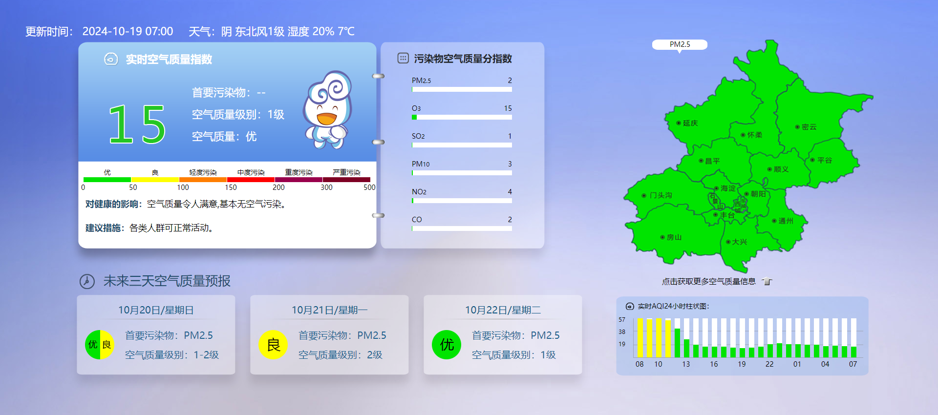 据北京市生态环境监测中心今早7时数据,目前实时空气质量指数15,空气质量优。