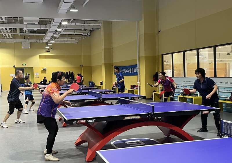 高兴如(前排左一)在回龙观体育文化公园的乒乓球馆内打球。中青报·中青网记者 张艺/摄