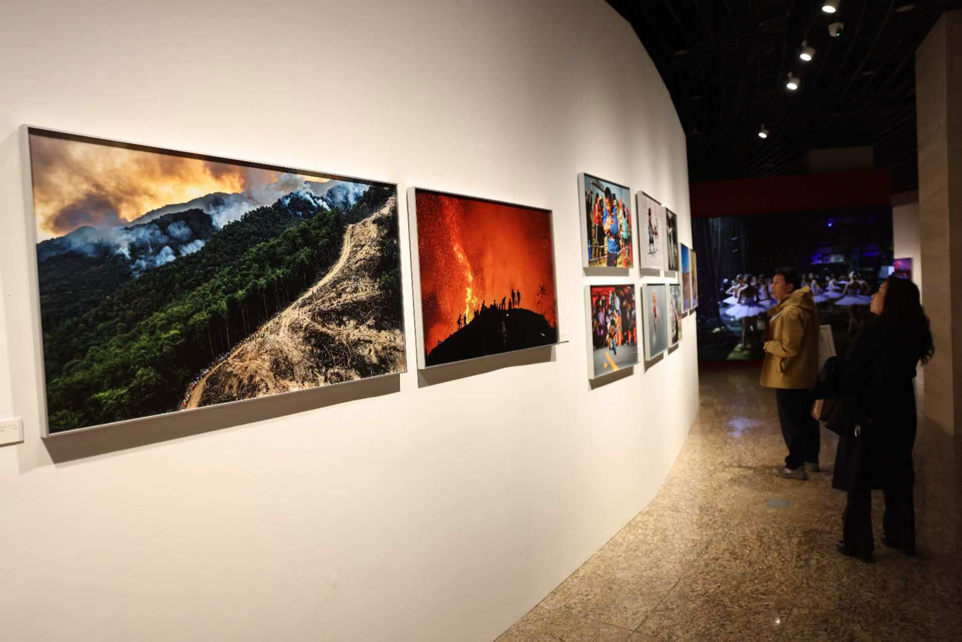 观众在观看“繁花竞放——深入生活扎根人民十年摄影精品展”。