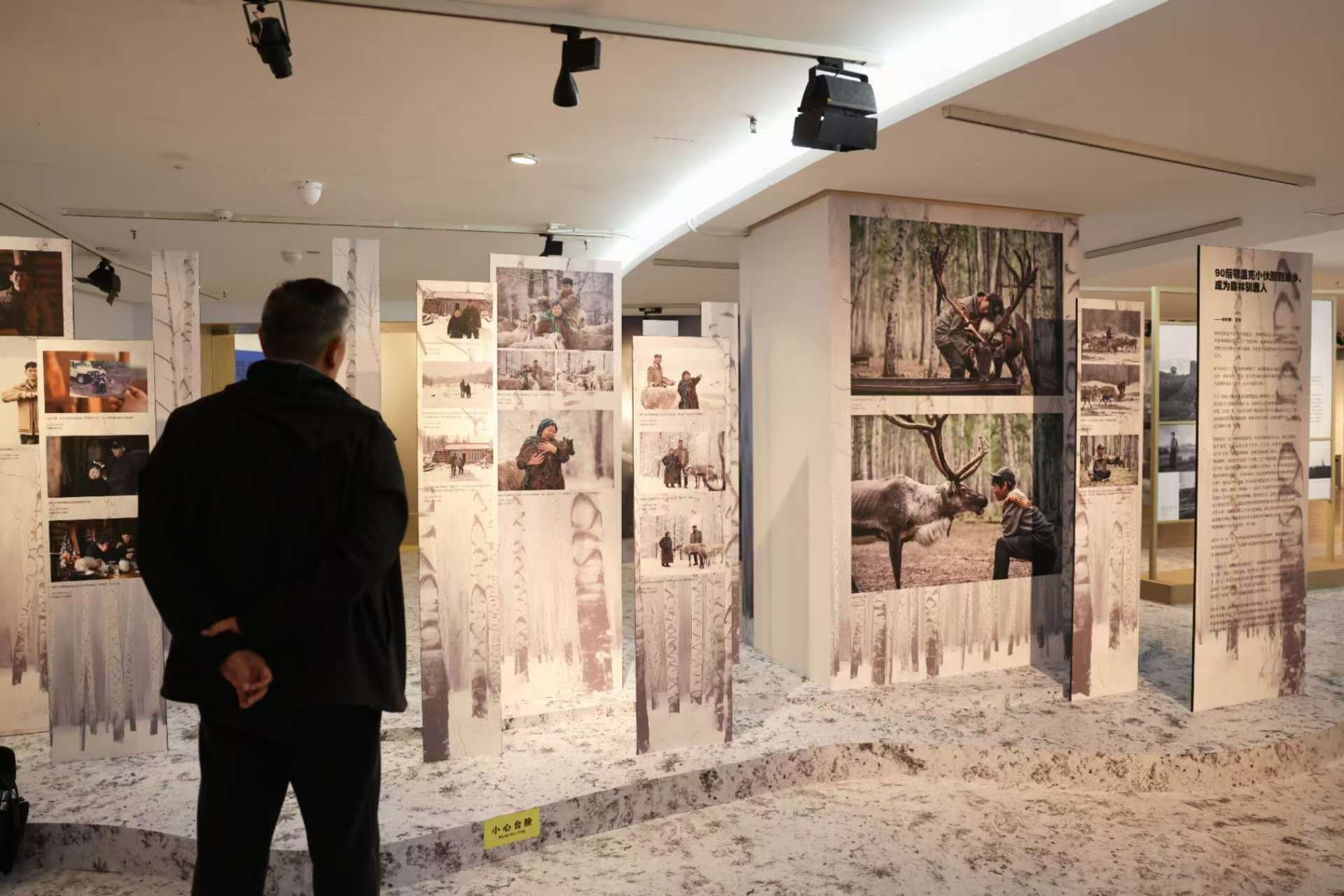 观众在观看《第五届中国民族影像志摄影双年展》的鄂温克族作品。