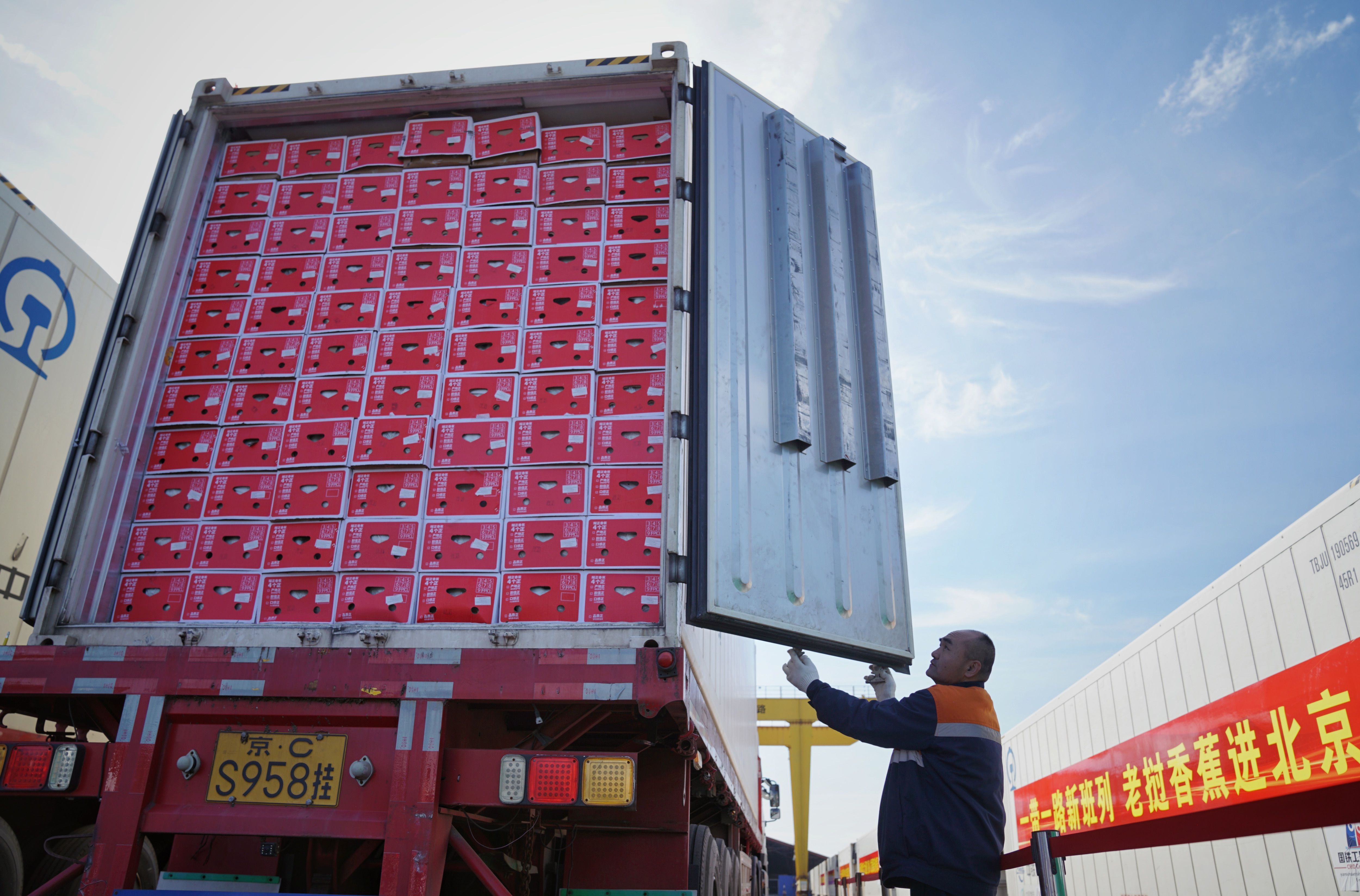 新京报讯(记者曹晶瑞 薛珺)10月20日上午,“京滇·澜湄线”中老铁路国际货运列车抵达平谷区京平综合物流枢纽,首批390吨老挝新鲜香蕉将进入京津冀地区的批发中心。这是北京首次通过中老铁路从东南亚进口水果。新京报记者从现场获悉,预计12月初班列将实现常态化开行。