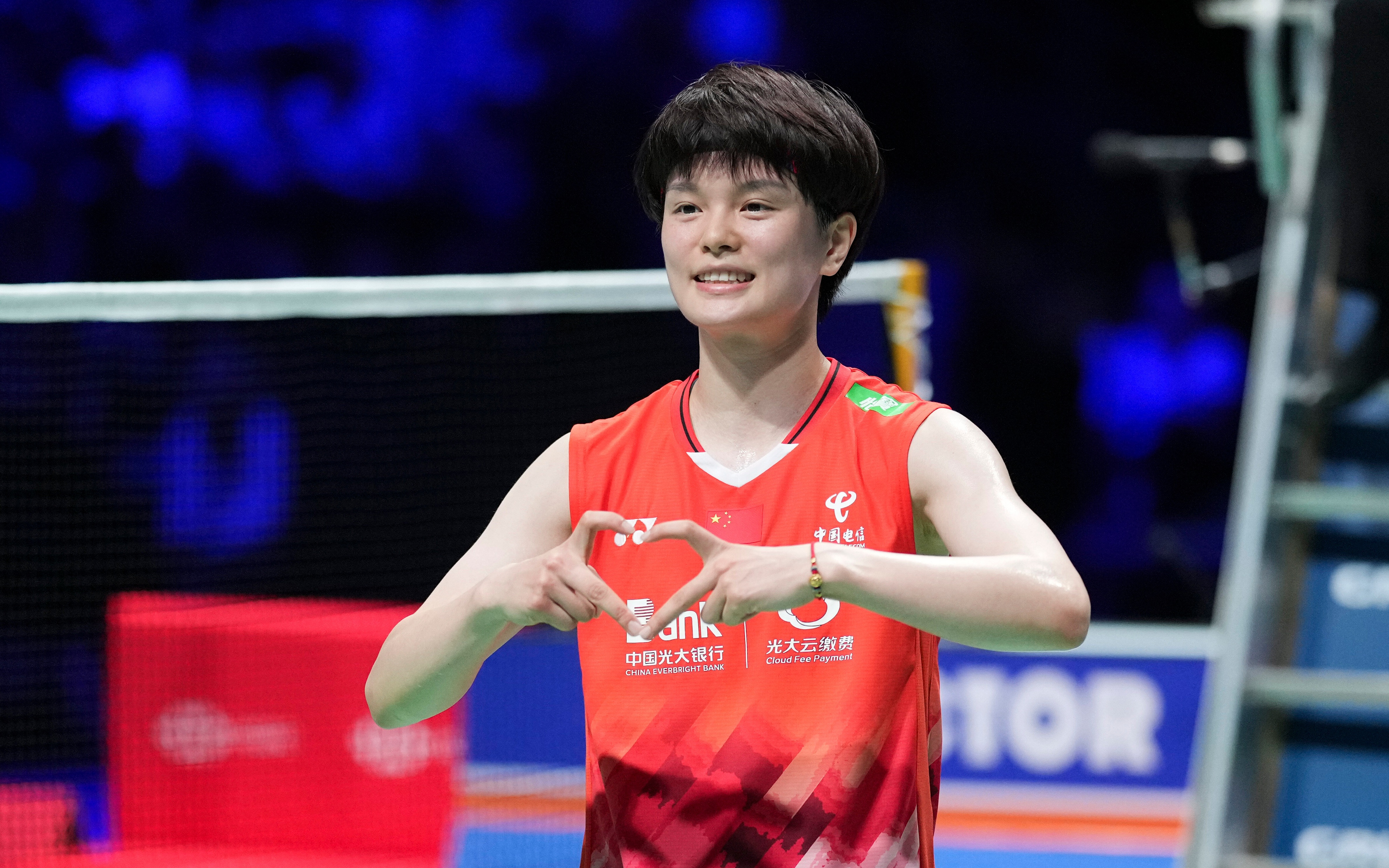 女单夺冠后,王祉怡“比心”庆祝。 图/新华社