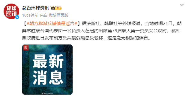 据中央广播电视总台环球资讯官博消息,据法新社、韩联社等外媒报道,当地时间21日,朝鲜常驻联合国代表团一名负责人在纽约出席第79届联大第一委员会会议时,就韩国政府近日发布朝方派兵援俄消息反驳称,这是毫无根据的谣言。