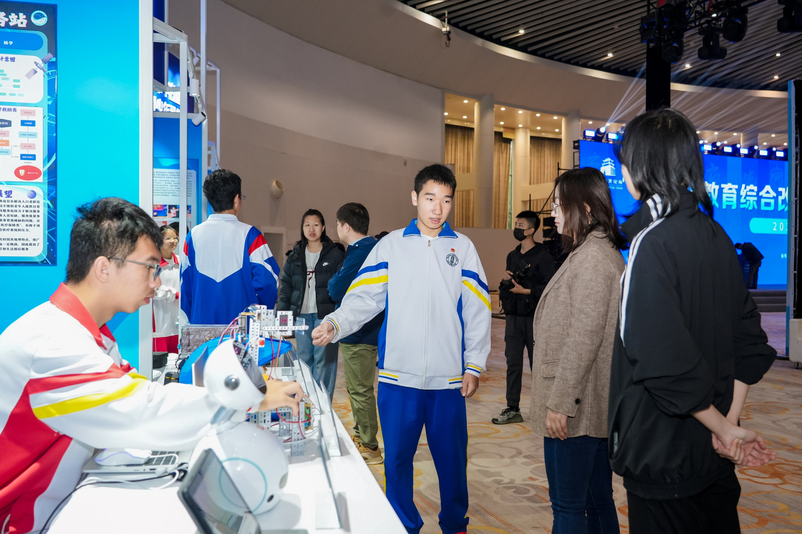 北京市第十中学的高中生向嘉宾介绍他设计的机器人。受访者供图