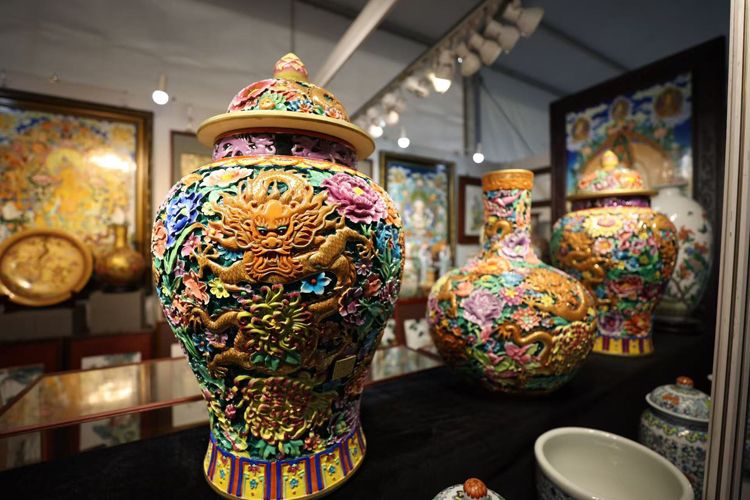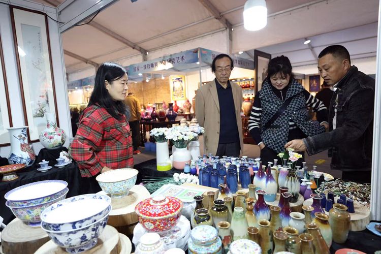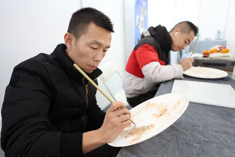 10月30日,江西省陶瓷文化周在潘家园旧货市场启幕。本次陶瓷文化周由江西省陶瓷行业协会指导,以“传承与创新”为主题,多位国家级和省级陶瓷大师携代表作品亮相活动现场。图为工艺大师在瓷盘上绘画。