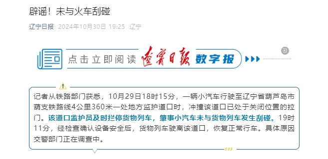 据辽宁日报消息,记者从铁路部门获悉,10月29日18时15分,一辆小汽车行驶至辽宁省葫芦岛市葫支铁路线4公里360米一处地方监护道口时,冲撞该道口已处于关闭位置的拉门。该道口监护员及时拦停货物列车,肇事小汽车未与货物列车发生刮碰。19时11分,经检查确认设备安全后,货物列车驶离该道口,恢复正常行车。具体原因交警部门正在调查中。