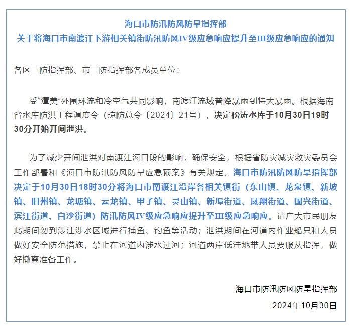 为了减少开闸泄洪对南渡江海口段的影响,确保安全,根据省防灾减灾救灾委员会工作部署和《海口市防汛防风防旱应急预案》有关规定,海口市防汛防风防旱指挥部决定于10月30日18时30分将海口市南渡江沿岸各相关镇街(东山镇、龙泉镇、新坡镇、旧州镇、龙塘镇、云龙镇、甲子镇、灵山镇、新埠街道、凤翔街道、国兴街道、滨江街道、白沙街道)防汛防风Ⅳ级应急响应提升至Ⅲ级应急响应。请广大市民朋友此期间勿到涉江涉水区域进行捕鱼、钓鱼等活动;泄洪期间在河道内作业船只和人员做好安全防范措施,禁止在河道内涉水过河;河道两岸低洼地带人员要服从指挥,做好撤离准备工作。