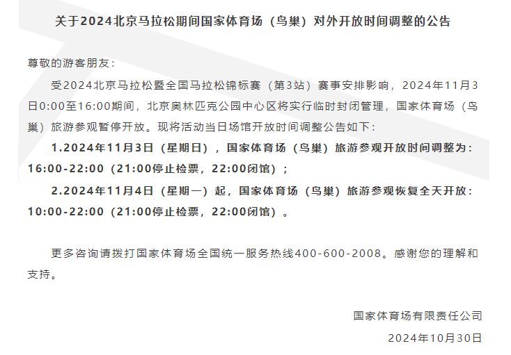 2024北马期间,鸟巢对外开放时间有调整