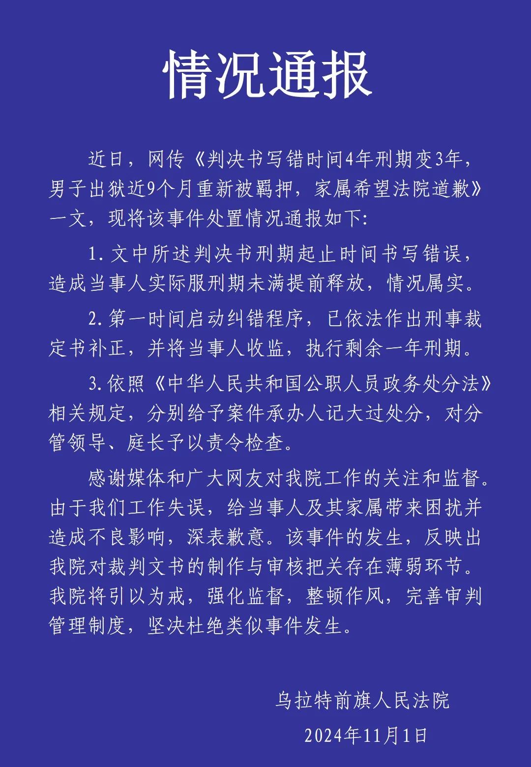 新京报讯 11月1日,乌拉特前旗人民法院官微发布情况通报,内容如下: