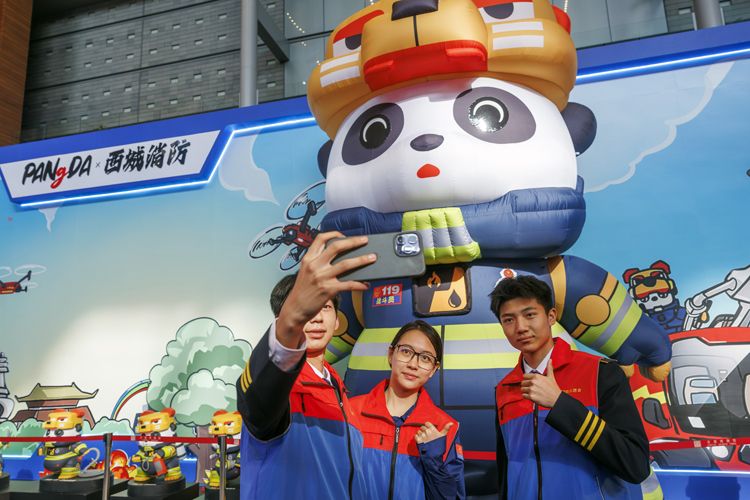 活动中首次展示了消防宣传主题卡通形象代言人“胖哒”,以增强公众对消防的了解和参与。消防志愿者与消防“胖哒”合影。