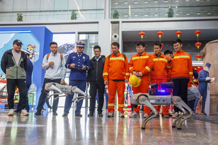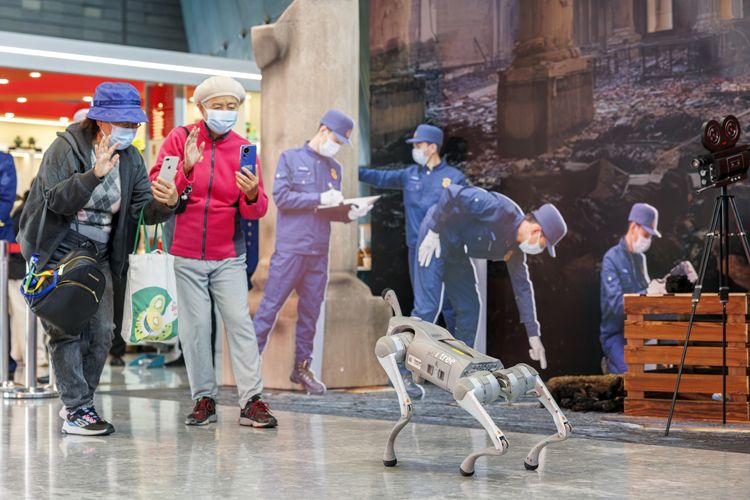 市民与机器狗互动。