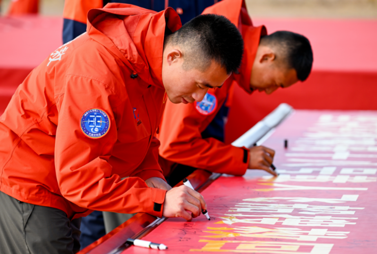 誓师大会上,空中分队、地面分队、额济纳旗民兵分队,依次派出代表上台表决心。同时,为进一步激发广大参试人员的斗志、树立典型,还表彰了神舟十八号载人飞船搜救回收任务搜救尖兵。