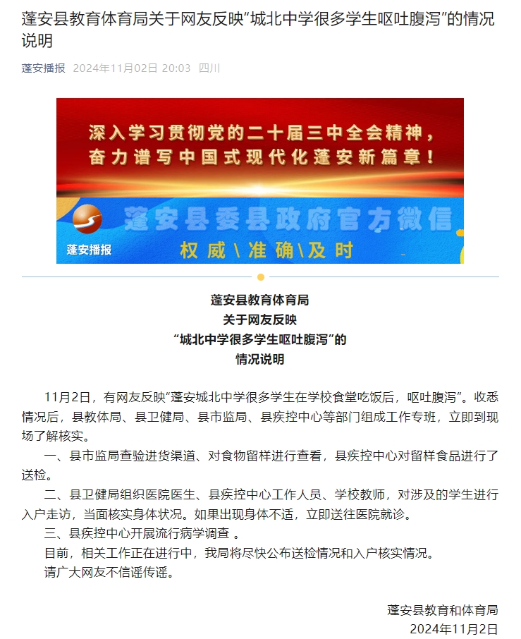 11月2日,有网友反映“蓬安城北中学很多学生在学校食堂吃饭后,呕吐腹泻”。收悉情况后,县教体局、县卫健局、县市监局、县疾控中心等部门组成工作专班,立即到现场了解核实。