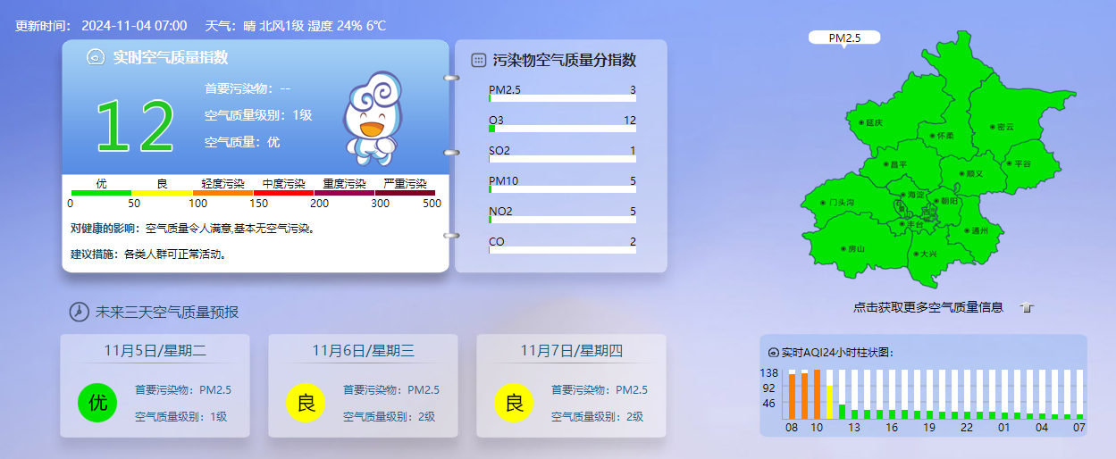 据北京市生态环境监测中心今早7时数据,目前实时空气质量指数12,空气质量优。