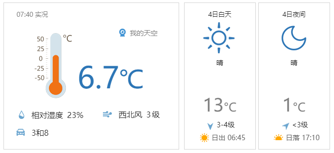 今天白天晴,北风三四级(阵风六七级)转南风一级,最高气温13℃;夜间晴间多云,南转北风一二级,最低气温1℃。