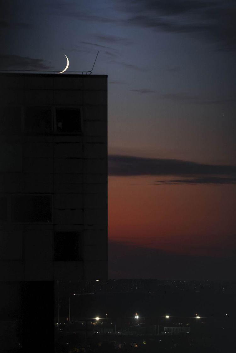 11月4日17时45分,西四环,月亮落到楼宇上,夕阳越来越暗淡。