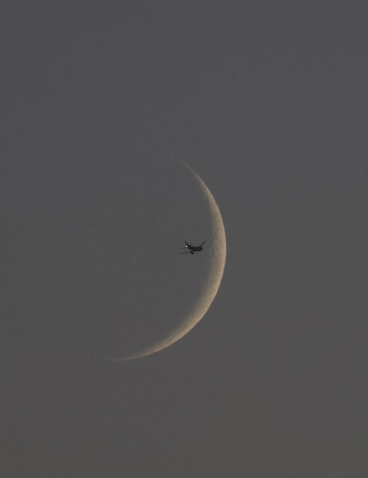 11月4日17时22分,西四环,飞机掠过弯月。