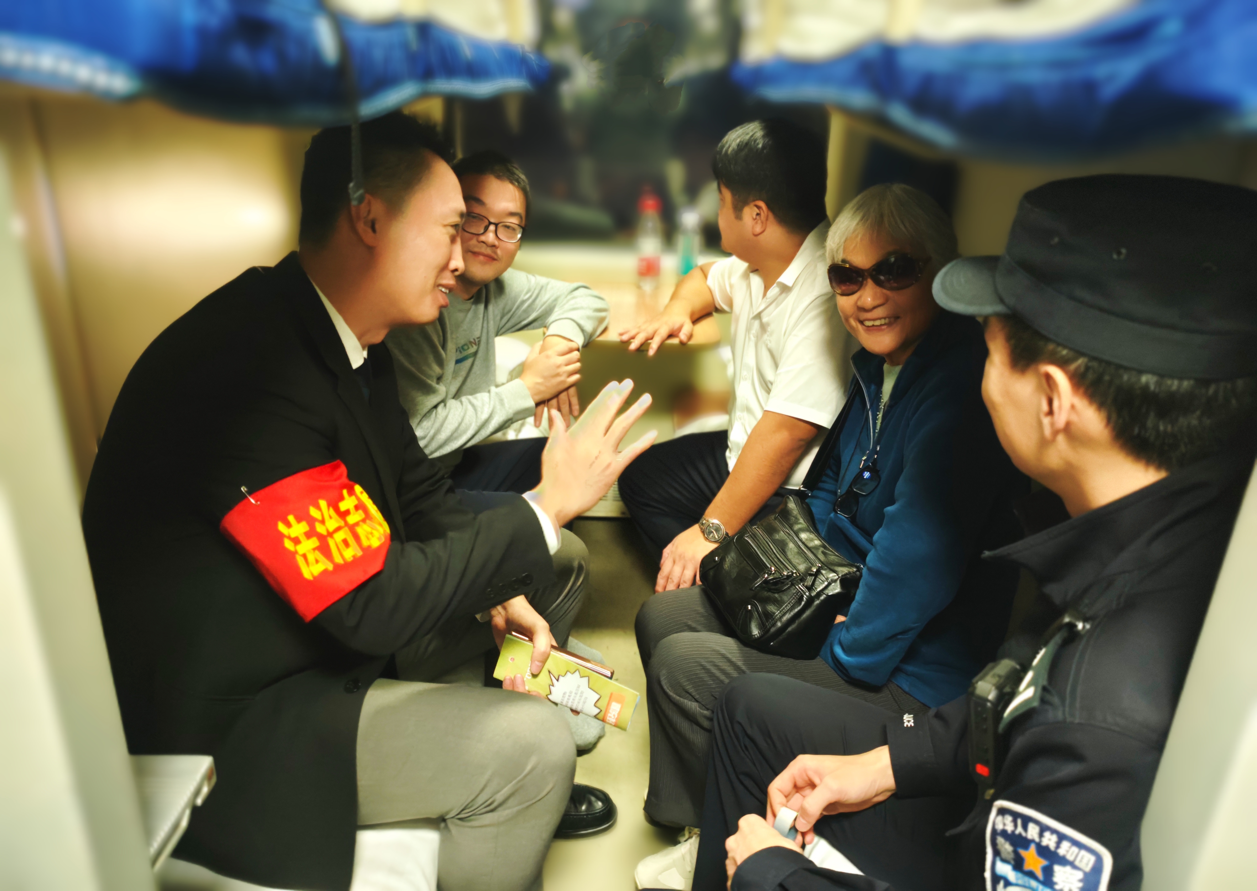 “法治志愿者”在列车上与乘客交流。受访者供图