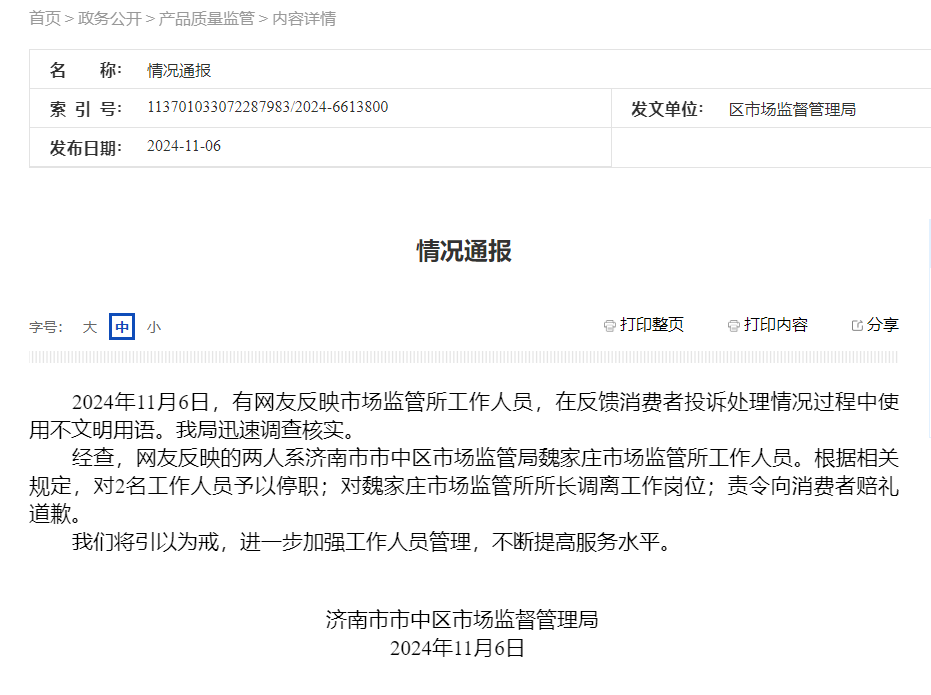 新京报讯 据济南市市中区政府网站消息,2024年11月6日,有网友反映市场监管所工作人员,在反馈消费者投诉处理情况过程中使用不文明用语。我局迅速调查核实。