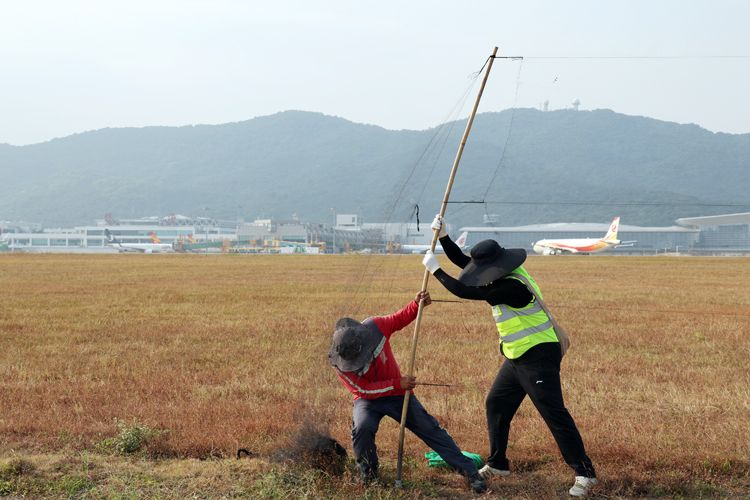 11月5日,机场驱鸟工作人员正在跑道旁架设驱鸟网。机场加紧布置驱鸟工作,利用驱鸟声波、喇叭、驱鸟炮等设备,为每一架参展飞机“保驾护航”。