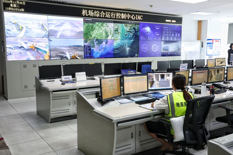 机场综合运行控制中心,工作人员加强监控、及时监督与协调。珠海机场各部门单位借鉴往届航展及重大活动保障经验,从航站楼公共安全、机场控制区安全防范、安全检查(人员、车辆、货邮)、重点目标防护、货运安保、隐患排查及应急处置等方面落实安保措施。