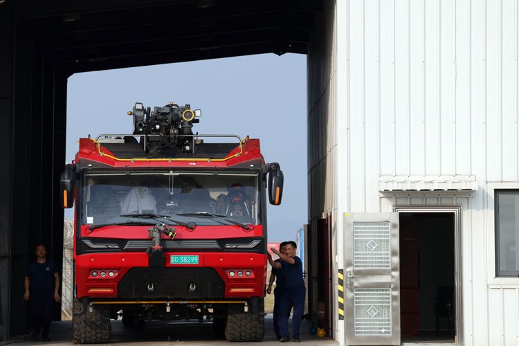 珠海机场在航空安保人员配备、安保设施设备、工作流程等方面也进行优化完善,加强对航展航空器通道、机场道口通行管制和安保监护。图为机场消防在执勤点位待命。