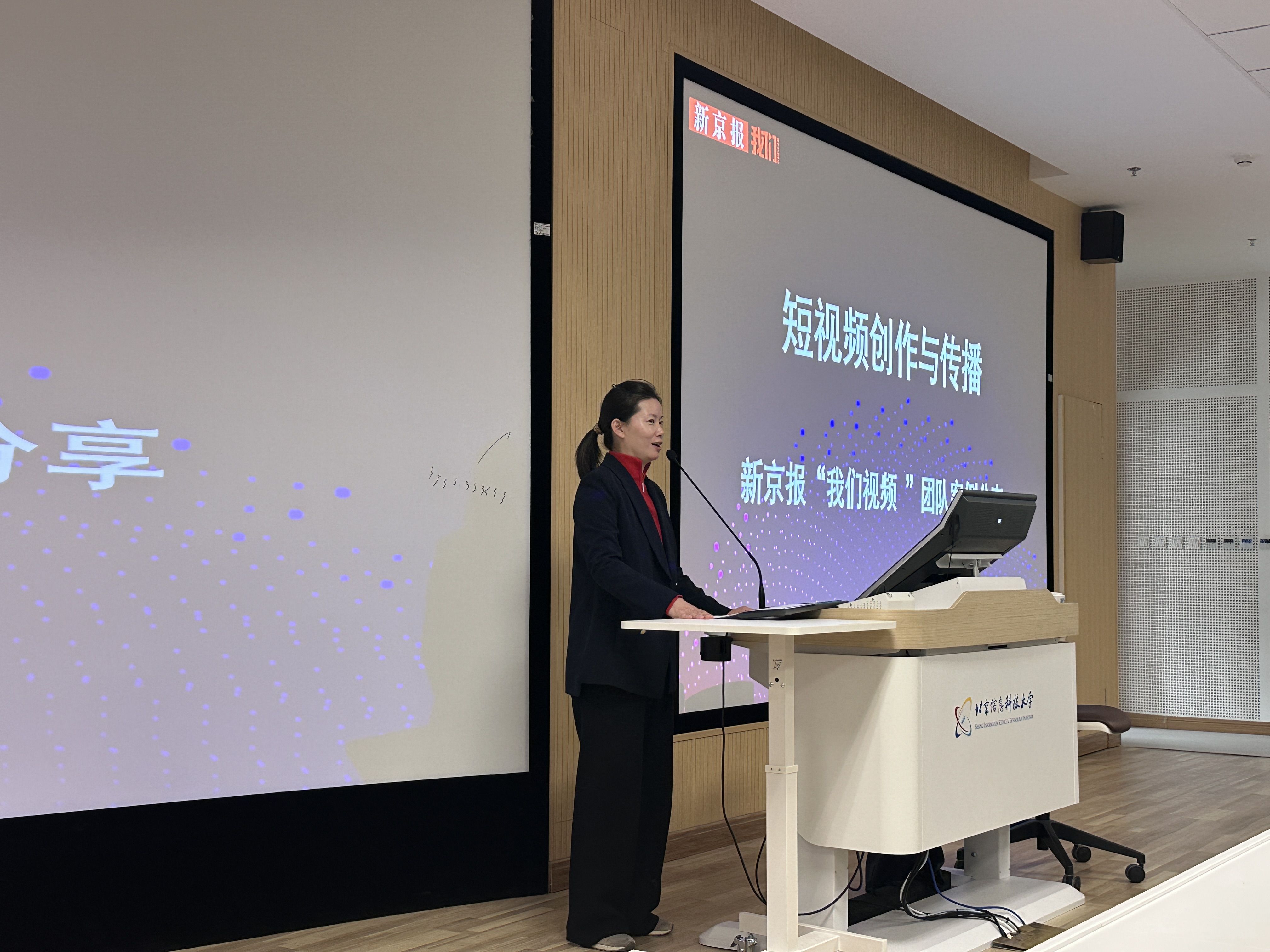 新京报社“我们视频”团队负责人周军老师从视频选题、拍摄制作、标题撰写以及发布运营等层面开展了短视频创作技法讲座,新京报社视频编辑贺亚雯老师现场对北京信息科技大学公管传媒学院学生团队创作的短视频作品进行了点评,并就学生提出的问题进行了答疑解惑。