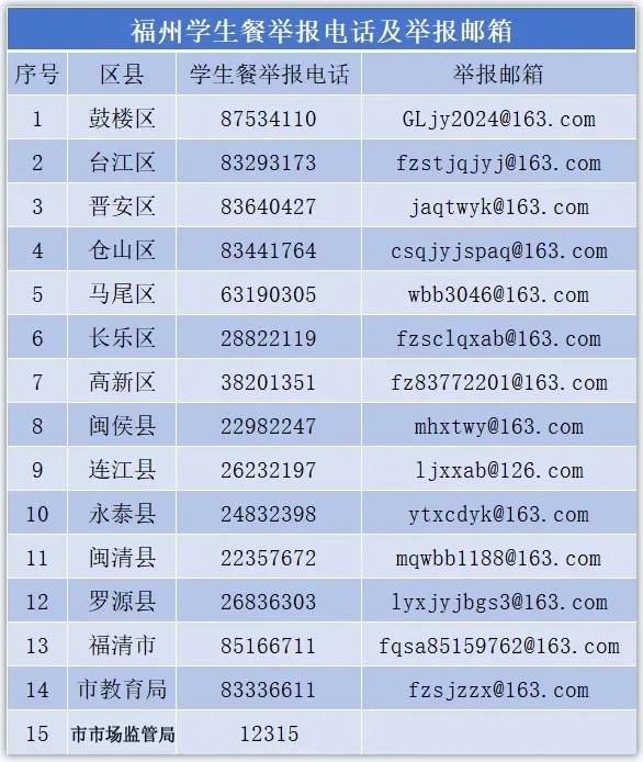 “福州教育”微信公众号还发布了福州学生餐举报电话及举报邮箱: