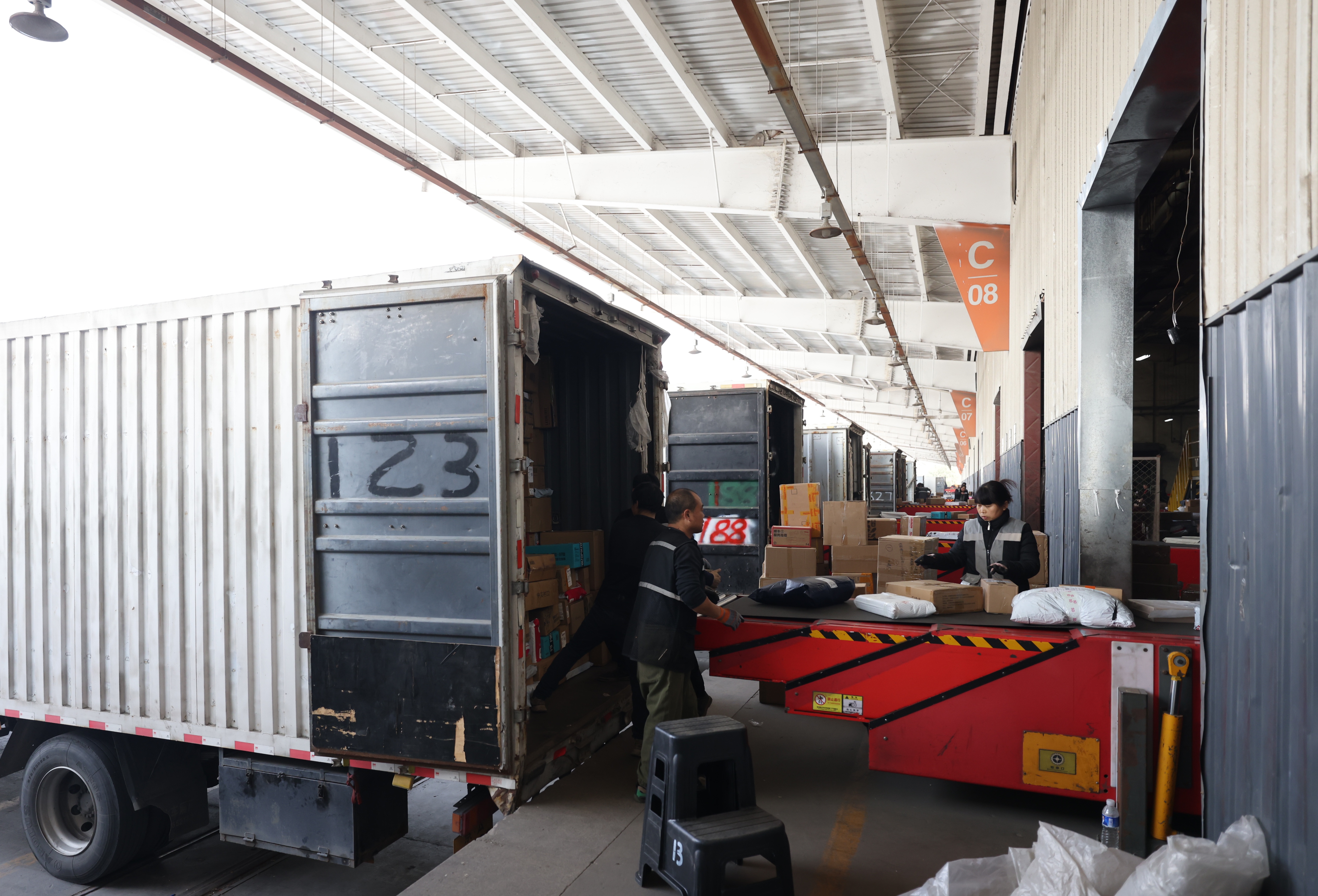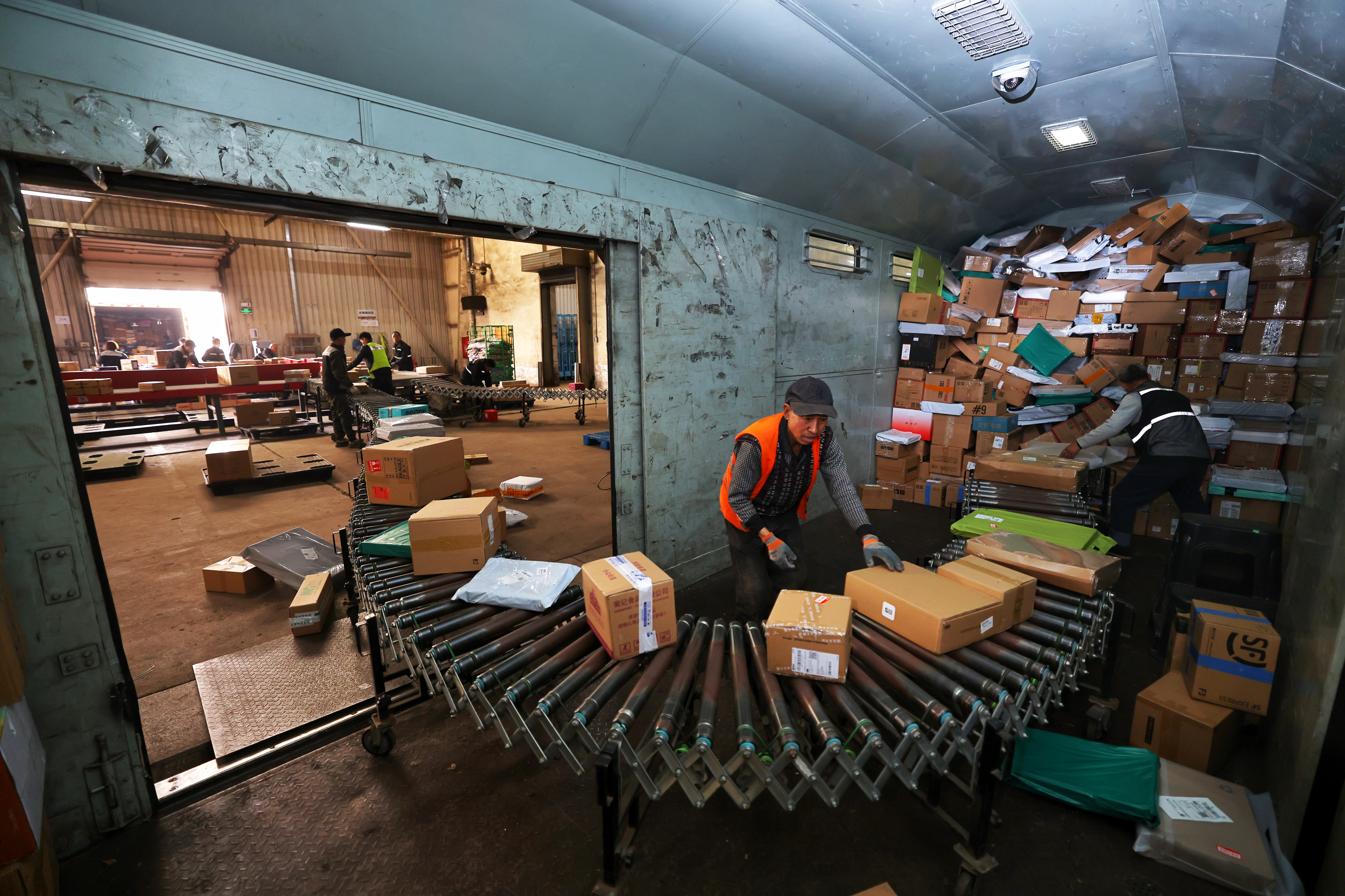 11月7日9时36分,一列满载10万件快件的X104次特快货物班列驶入黄村货场,列车停稳后,作业人员快速有序地卸车、分拣,随后将货物装入汽车,以最快速度送至客户手中。