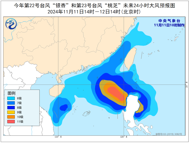 “银杏”“桃芝”和冷空气联手,将给海南岛、广东等地带来大风。中央气象台预计,11月11日14时至12日14时,台湾海峡、南海北部和中部、巴士海峡、西沙群岛、东沙群岛、海南岛东部沿海、台湾岛西部和东南部沿海、福建沿海、广东东部沿海将有6-8级、阵风9-10级的大风,其中南海中东部的部分海域风力可达9-10级、阵风11-12级,“桃芝”中心经过的附近海域和地区风力可达11级,阵风12-13级。